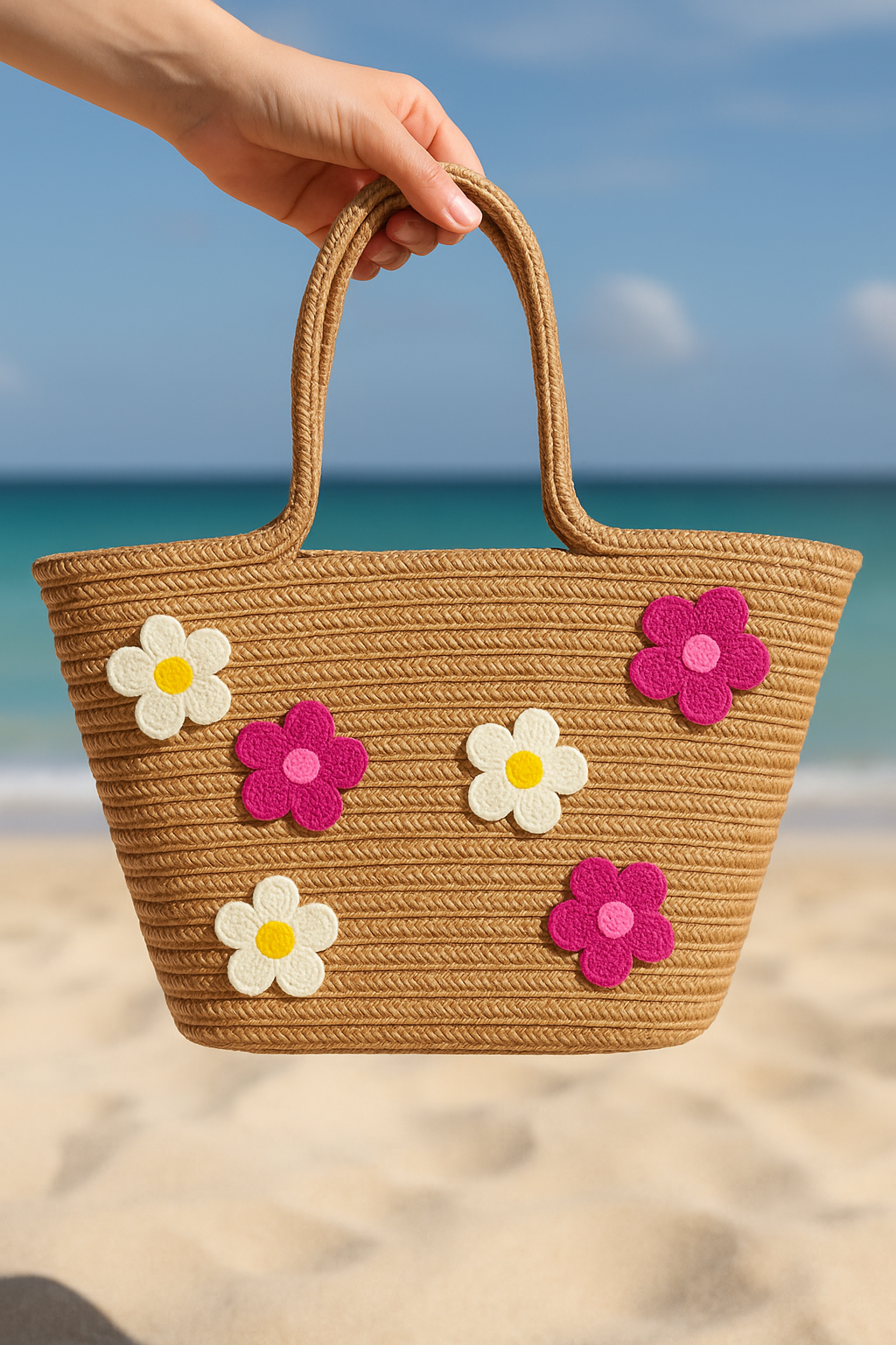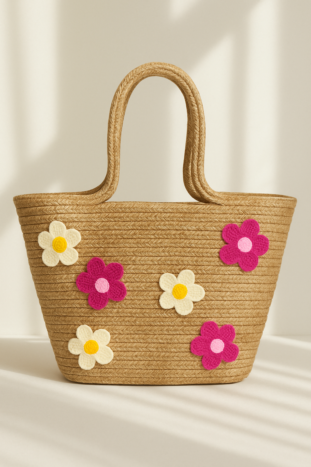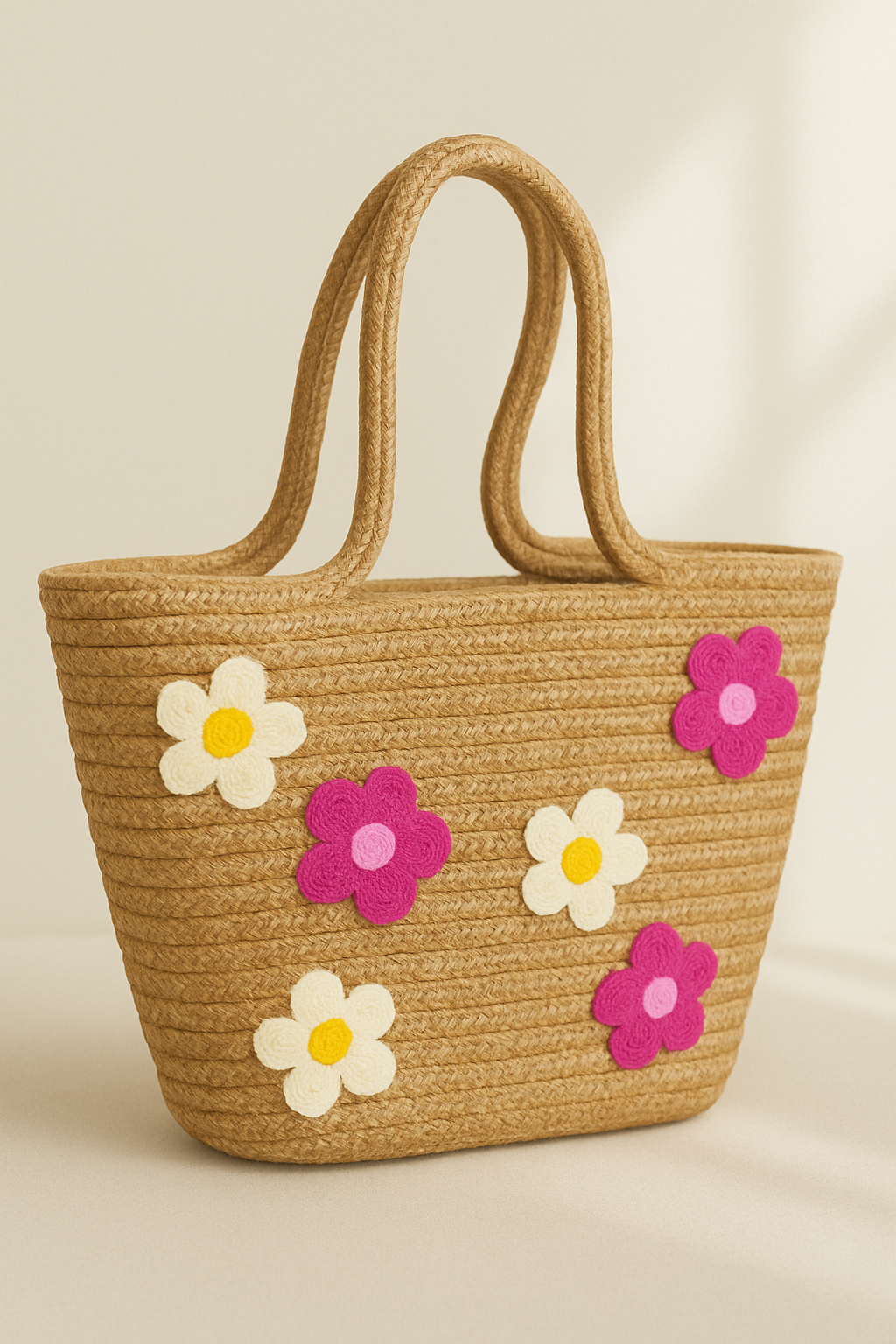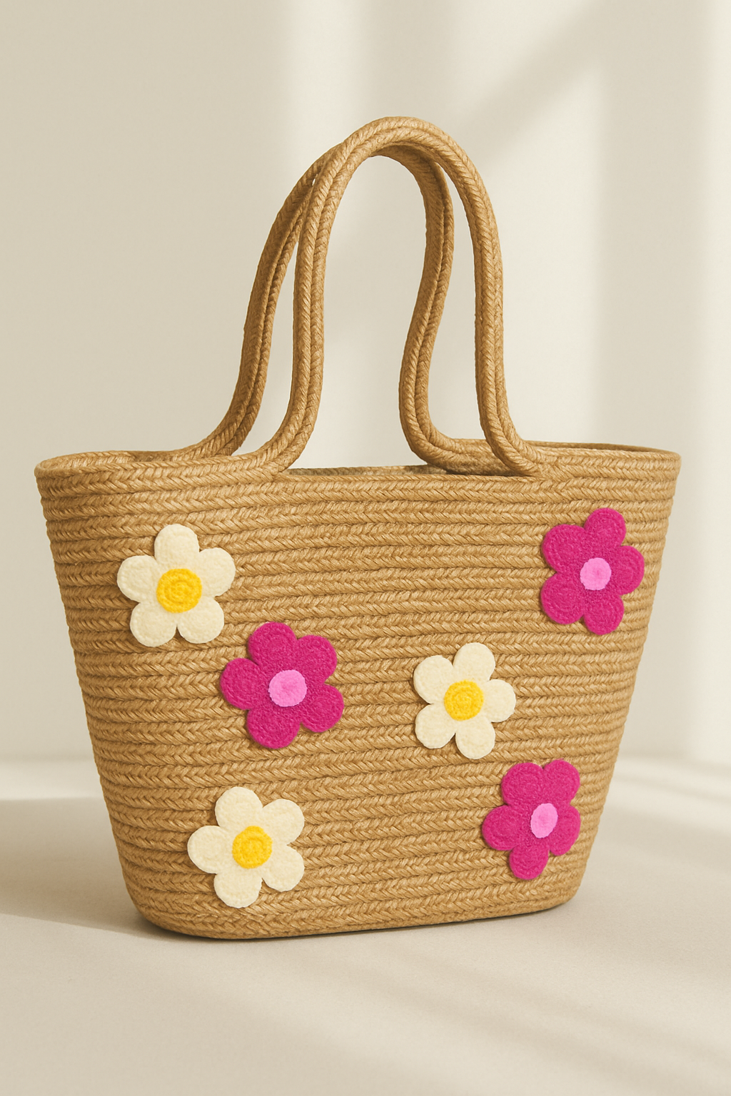 Renkli Papatya Nakış Detaylı Jüt Plaj Çantası
